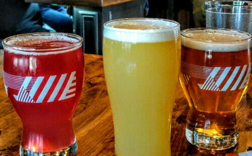 The Shop Beer Co. is located in an old home that has been renovated into a cozy neighborhood hangout. They have a great outdoor space, the “backyard” patio with lights and a colorful mural. Guests can bring in food or order delivery.